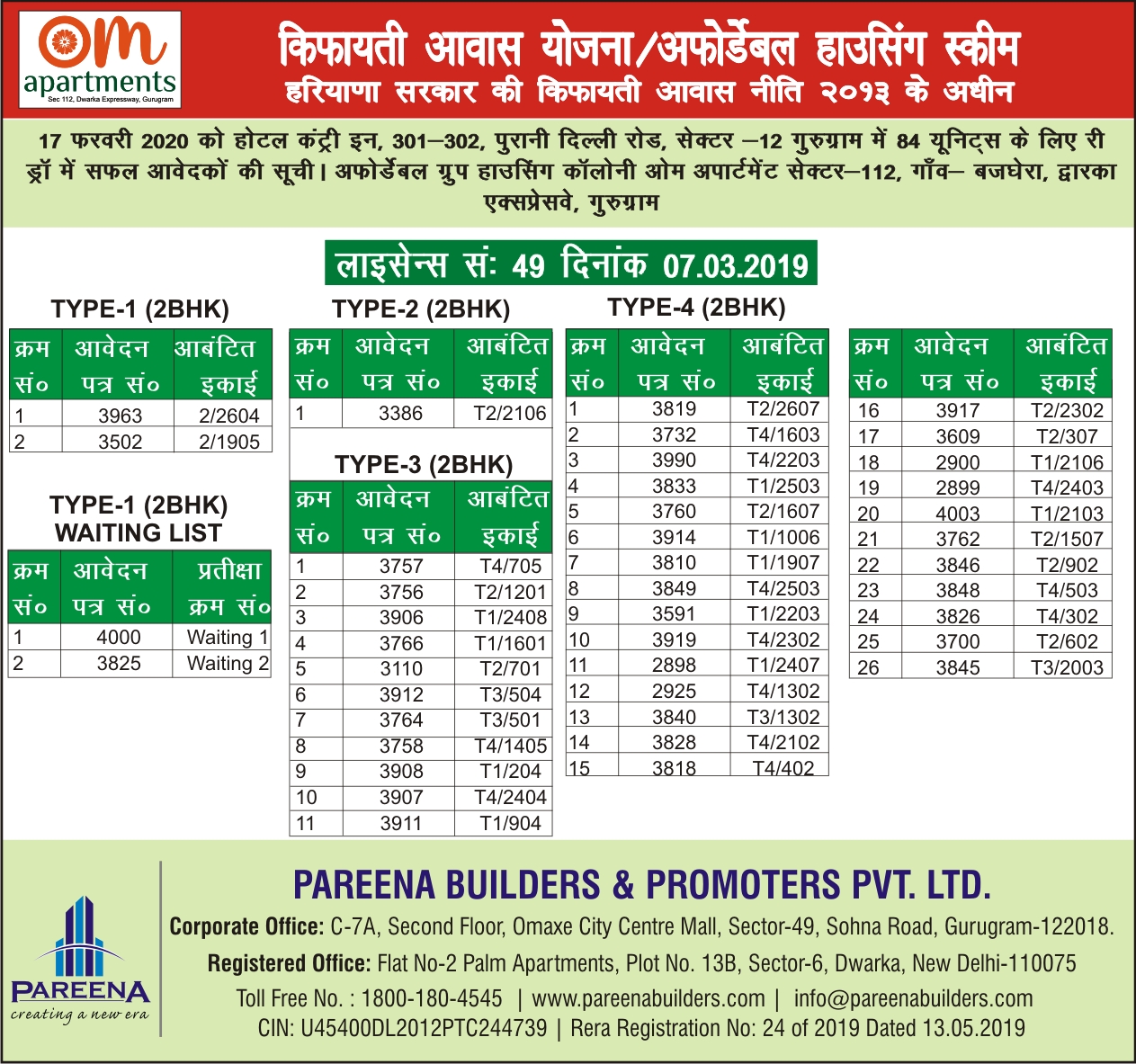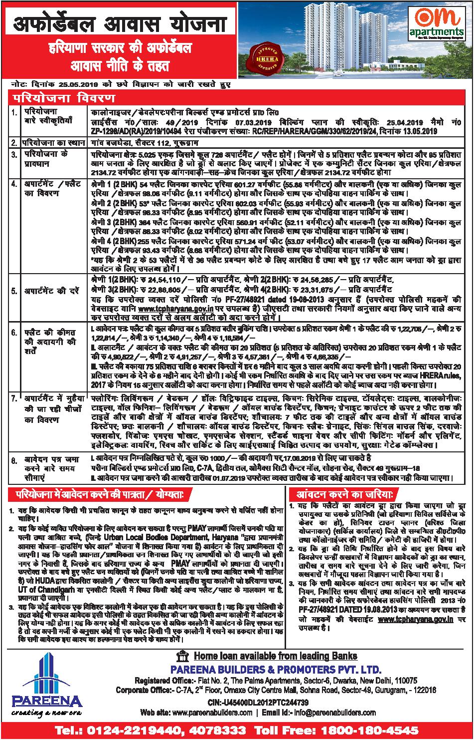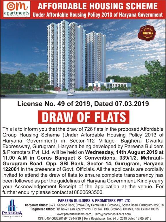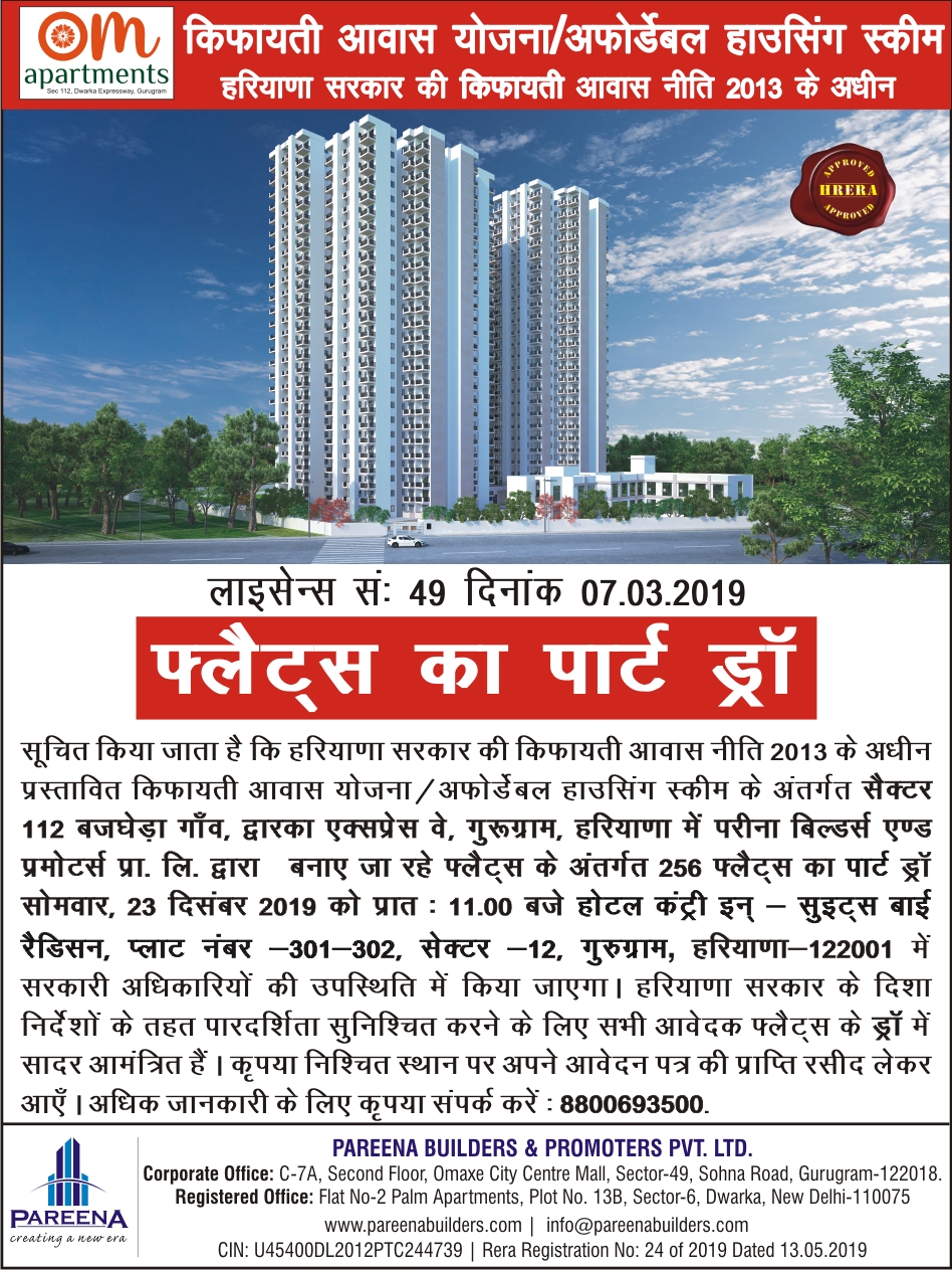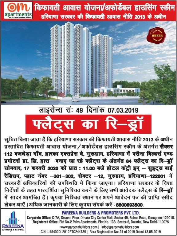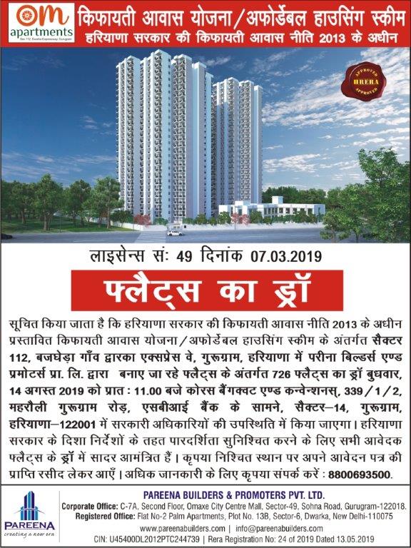 Disclaimer: - Our Company is not accepting any cash or any other consideration in connection with booking or allotment of flat in Om Apartments project and also we have not authorized any other person in this behalf, Hence, if any person gives or accepts cash for booking or allotment of flat in this project our Company shall not be held liable.